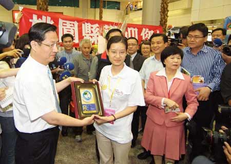 兩岸周末包機(jī)啟動(dòng),大陸居民赴臺(tái)觀光首發(fā)團(tuán)四日抵臺(tái),搭乘南方航空的香港城市大學(xué)的博士研究生陳婷婷(左二),經(jīng)過計(jì)算機(jī)選號,成為首發(fā)團(tuán)來臺(tái)第一人。 “中央社”圖