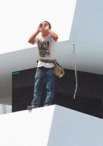 一名莊姓裝潢工人昨天站在臺北市信義路五段陳水扁“寶徠花園廣場”住宅旁的樣品屋屋頂,對著陳水扁所住豪宅,高喊“阿扁你對不起臺灣人民”,還要他把貪污的錢給還出來!(圖片來源:臺灣《聯(lián)合報(bào)》)