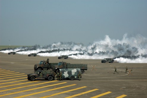 臺軍第五作戰(zhàn)區(qū)“漢光24號”演習,23日在臺中清泉崗空軍基地舉行空降暨反空降演練。圖為煙幕排以五輛渦輪發(fā)煙車,對空降場實施煙幕遮障。(“中央社”圖)