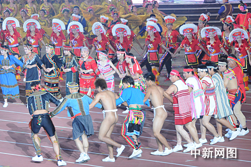 中新網(wǎng)泉州10月26日電 第六屆農(nóng)民運(yùn)動(dòng)會(huì)今晚在福建省泉州市隆重開幕。圖為臺(tái)灣泰雅族、阿美族在開幕式上表演的“豐年祭”精彩舞蹈。