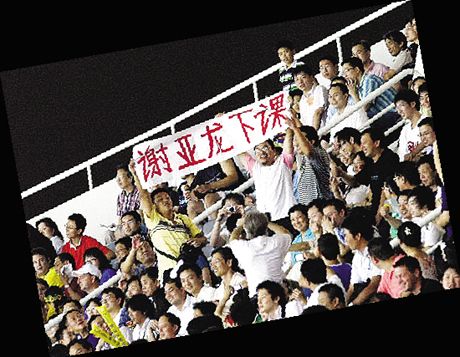 謝亞龍作為中國足協(xié)的一把手,在其任期內(nèi)也是語錄翻新不斷,從亞洲兵敗的吟詩:“恨不抗日死,留作今日羞。國破尚如此,我何惜此頭”到女足奧運無緣四強之后說:“女足該練練叉腰肌!辈贿^,語錄再多也不能當球踢,國足和國奧糟糕的戰(zhàn)績讓中國球迷們?nèi)虩o可忍,在很多地方打出了“謝亞龍下課”的標語,而在北京奧運會期間,這句話更取代了“加油”的助威聲。
