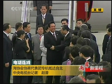 臺灣;鶗倍麻L兼秘書長高孔廉與大陸海協(xié)會常務副會長鄭立中等人到機場接機。