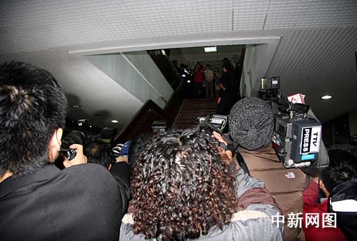 12月29日下午2時,臺北地方法院召開前臺灣地區(qū)領(lǐng)導人陳水扁羈押庭,經(jīng)過長達12多小時的庭訊、評議后,合議庭審判長蔡守訓30日2時25分裁定將陳水扁羈押,但不禁見。圖為消息傳出后,臺北地方法院樓上樓下一陣騷動。 (中新社記者 陳立宇/攝)