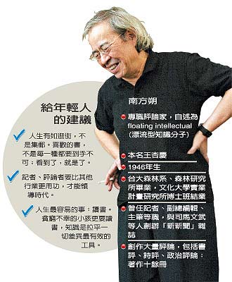 大學(xué)念的是森林,“其它的,我都不會(huì)”;但南方朔說他用個(gè)笨方法,卻是最實(shí)在的:找來所有大學(xué)最基本的教科書,從頭老實(shí)讀起。