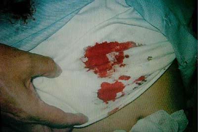 陳水扁露出剛進入醫(yī)院治療時的斑斑血跡供院方拍照。