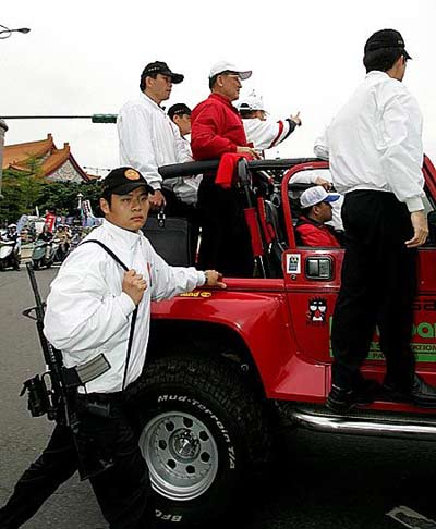 在聞訊陳水扁及呂秀蓮遭槍擊后,在國民黨中央黨部前也準備出發(fā)掃街的連宋陣營聞訊,立即緊急成立一級戒備,特勤人員荷槍實彈,如臨大敵。