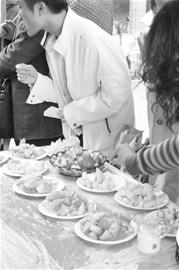 “棺材板,是什么東東,也能吃啊?”“啊,還有傳說中的臺灣水果啊!迸_灣美食的魅力果然不小,盡管下著小雨,不過話音才落,過往的廈大學子紛紛駐足,嘗嘗這餅,品品那糖,“味道還真不錯耶”。