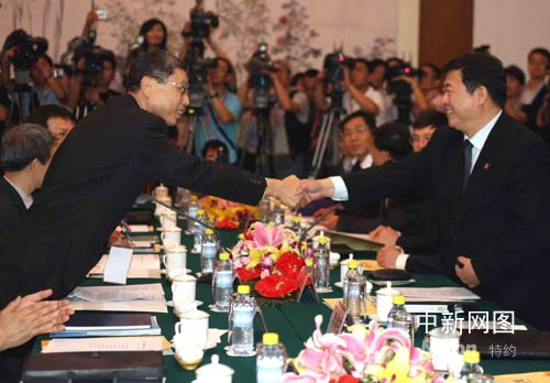 6月12日上午,海峽兩岸關(guān)系協(xié)會(huì)副會(huì)長(zhǎng)孫亞夫(右)與臺(tái)灣海峽交流基金會(huì)副董事長(zhǎng)高孔廉在北京釣魚(yú)臺(tái)5號(hào)樓協(xié)商兩岸周末包機(jī)。中新社記者 任晨鳴 攝
