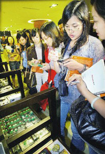 據(jù)悉,踩線團(tuán)成員中大約有四分之一到過(guò)臺(tái)灣。在參觀完臺(tái)北“故宮博物院”后,團(tuán)員們心情愉快,雖被媒體緊盯,仍不影響消費(fèi)力,采買(mǎi)許多“故宮”小飾品。其中,每個(gè)100元(新臺(tái)幣,下同)仿翠玉白菜吊飾和每個(gè)300元的頌壺耳環(huán),很多人一口氣就買(mǎi)五、六個(gè)翠玉白菜。