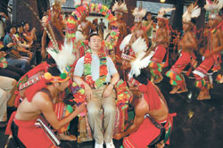 大陸踩線團(tuán)團(tuán)長范貴山,被當(dāng)成臺(tái)灣少數(shù)民族大頭目,接下許愿酒,連干三杯,許下北京奧運(yùn)成功、兩岸旅游“火火紅紅”、兩岸人民幸福美滿等三個(gè)愿望。