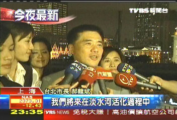當(dāng)晚外灘鐘聲敲過(guò)8點(diǎn)15分,臺(tái)北市長(zhǎng)郝龍斌暌違上海3年,再度登船游黃浦江。報(bào)道說(shuō),端出臺(tái)灣荔枝招待,上海市安排的游船,連戰(zhàn)夫婦、宋楚瑜夫婦都坐過(guò),為了郝龍斌一行人安全游江,還派出巡邏艇來(lái)回護(hù)航。郝龍斌聽(tīng)著導(dǎo)游介紹外灘的萬(wàn)國(guó)建筑,想的是怎么把外灘移植到臺(tái)北的藍(lán)色公路。