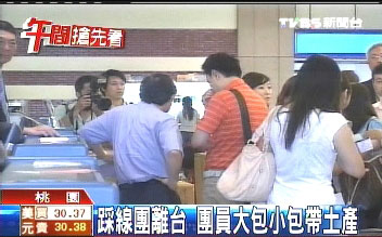 大陸踩線團(tuán)結(jié)束在臺考察行程,今天(26日)上午搭機(jī)離開臺灣,帶回不少當(dāng)?shù)靥禺a(chǎn)。(圖:臺灣TVBS)
