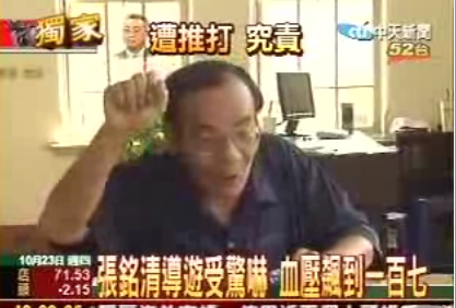 海協(xié)會(huì)副會(huì)長(zhǎng)張銘清在臺(tái)遭襲事件,不但令國(guó)際震驚,就連臺(tái)南人自己也被嚇了一大跳。據(jù)臺(tái)灣中時(shí)電子報(bào)23日消息稱(chēng),當(dāng)天擔(dān)任張銘清在孔廟的導(dǎo)游的江文章,說(shuō)自己當(dāng)時(shí)被嚇得腦袋一片空白,后來(lái)量血壓,竟然發(fā)現(xiàn)血壓飆高到170。