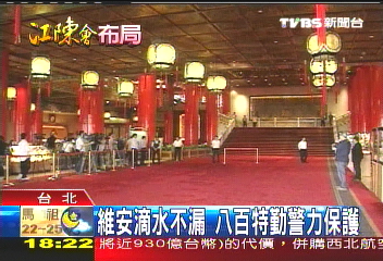 據(jù)臺灣TVBS報道,這回光是警力,“警政署”就動員七千人次負(fù)責(zé)安全。從飯店牌樓,一直到大廳,都有便衣刑警站崗,同時后方的停車場,還有支持保警24小時待命。