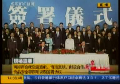 中新網(wǎng)臺(tái)北11月4日電 據(jù)本網(wǎng)記者從現(xiàn)場(chǎng)發(fā)回的消息:大陸海協(xié)會(huì)會(huì)長(zhǎng)陳云林與臺(tái)灣海基會(huì)董事長(zhǎng)江丙坤今天下午14時(shí)許在臺(tái)北就兩岸海運(yùn)、空運(yùn)、郵政、食品安全等議題簽署四項(xiàng)協(xié)議。