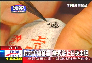 中新網(wǎng)11月4日電 臺(tái)北“江陳會(huì)談”今天舉行,臺(tái)灣;鶗(huì)準(zhǔn)備了鑲有6000金字的“和平協(xié)商,共創(chuàng)雙贏”的藝術(shù)字畫(huà),送給陳云林。據(jù)臺(tái)灣TVBS報(bào)道,字畫(huà)創(chuàng)作者、臺(tái)灣藝術(shù)家詹秀蓉透露,為了這幅字畫(huà),她不眠不休花了7天時(shí)間,才在最后一刻完成。不過(guò),見(jiàn)證兩岸歷史時(shí)刻,詹秀容說(shuō),她與有榮焉,所以分文不取。