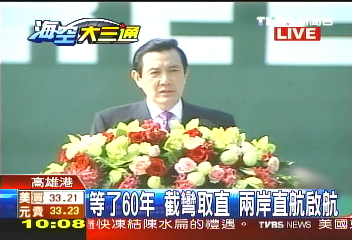 馬英九說:“兩岸直航所代表的意義,一方面代表兩岸的和解,不再走過去對立沖突的路線,也就是說,我們用談判取代對立,以和解取代沖突,兩岸共同謀求和平與繁榮。而從經(jīng)濟面來看,兩岸直航,在空運方面可節(jié)省大量時間,估計超過30億元,在海運方面也是一樣,每一個航次可節(jié)省16到27個小時。”