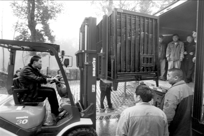 工作人員利用叉車將“圓圓”平穩(wěn)送進(jìn)專門設(shè)計(jì)的轉(zhuǎn)運(yùn)車。王磊攝(圖片來(lái)源:京華時(shí)報(bào))