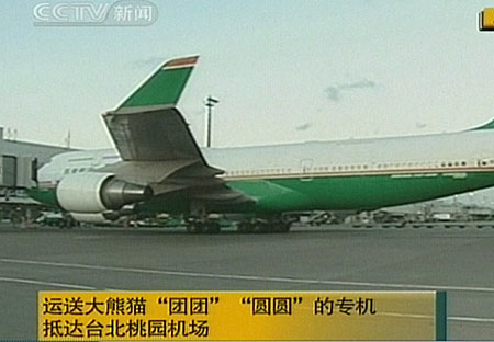 12月23日下午5時許,運送大熊貓“團團”“圓圓”的專機抵達臺北桃園機場。(電視截圖)