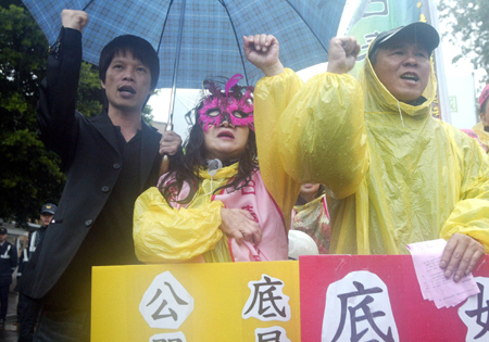 中新網(wǎng)11月27日電 臺灣性工作團體“日日春關(guān)懷互助協(xié)會”今天上午前往臺灣當局“行政院”門口陳情,要求兌現(xiàn)陳水扁“大選”時的承諾。知名導(dǎo)演侯孝賢與林靖杰也到場聲援。