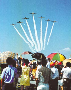 空軍雷虎小組也是遠(yuǎn)東地區(qū)第一支特技飛行小組,成立初期就以精湛技術(shù)揚(yáng)名國(guó)際。1957年,在菲律賓航空周首開先例九機(jī)編隊(duì)表演;1959年赴美參加第一屆航空表演,以九架軍刀機(jī)做低空表演贏得贊譽(yù)。