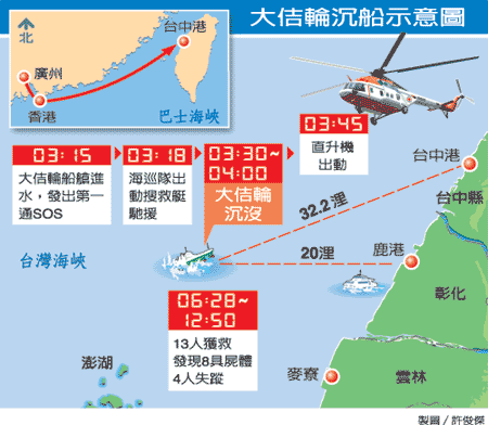 據(jù)臺灣《中國時(shí)報(bào)》報(bào)道,香港到臺中港的航線,平常很好航行,但正值冬季東北季風(fēng),風(fēng)浪較大,十四日凌晨更有十一級陣風(fēng),增加航行的危險(xiǎn)性。臺中海巡隊(duì)表示,該輪這次是載運(yùn)花崗碎石來臺,極可能貨艙沒有用帆布蓋好密合,或是貨艙有破裂,致打到甲板上的海浪,流進(jìn)貨艙,造成貨輪下沉。