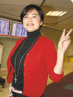 林青霞昨晚比著勝利的手勢(shì)返臺(tái)投票。(臺(tái)灣《聯(lián)合報(bào)》圖)