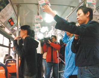 周美青上車時(shí),媒體跟著蜂擁上車,公交車司機(jī)嚇了一大跳,嘴巴張得開開的合不攏。上車時(shí)沒座位,周美青站著,像一般上班族戴上mp3聽音樂;到快下車前,才有個(gè)空位坐下。