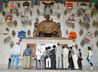 臺(tái)當(dāng)局推行“去蔣”政策,臺(tái)北中正紀(jì)念堂的蔣介石銅像被各式風(fēng)箏遮擋。4月1日起風(fēng)箏等將全部拆除,還大廳原貌。(圖:臺(tái)灣《聯(lián)合報(bào)》)