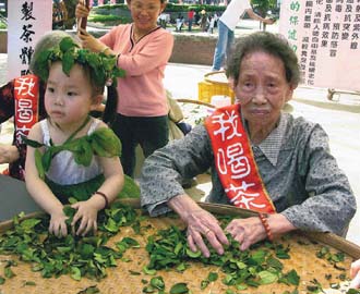 102歲茶農楊許好從花蓮趕來示范揉茶,他前一陣子排尿不順,開始每天喝茶3杯,排尿不順的癥狀就改善許多。與楊許好一同示范揉茶還有4歲女童江宜庭,她從2歲就喝茶,經(jīng)常與母對飲,樂在其中。