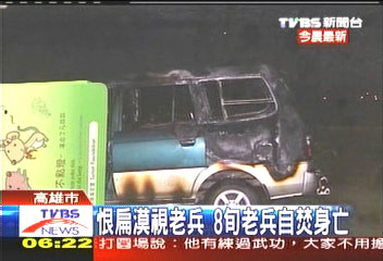 據(jù)臺(tái)灣TVBS報(bào)道,事發(fā)現(xiàn)場(chǎng),小客車被燒得只剩支架。疑似用汽油引火自焚的男子,是已經(jīng)高齡80歲的老兵許昭榮。
