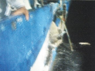 船長(zhǎng)何鴻義:“丟過去左邊所有東西都丟過去,包括這個(gè),里面有沒有東西,沒有,這個(gè)有沒有東西,沒有東西都丟過去船的左邊,放開啦!把繩子割斷!