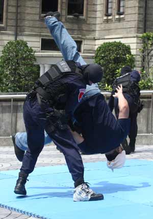 隊(duì)員演練如何制服歹徒 “中央社”圖