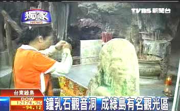 中新網(wǎng)6月18日電 據(jù)臺(tái)灣TVBS報(bào)道,綠島有個(gè)鐘乳石洞,里面有一座石筍,樣貌很像一座觀音,當(dāng)?shù)孛癖姺Q為“觀音洞”,相傳多年前,有一名婦人來(lái)這里拜拜求子,果然成功,故事不斷流傳,后來(lái)越來(lái)越多人相信,有從臺(tái)中、高雄來(lái),還有從基隆來(lái),他們數(shù)十個(gè)人包船或搭機(jī)來(lái),現(xiàn)在觀音洞,已經(jīng)成了綠島知名的觀光地區(qū)。