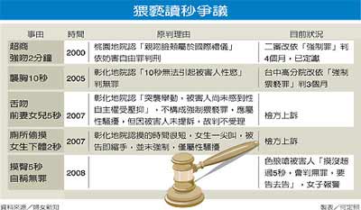 “襲胸十秒無罪事件”,發(fā)生在05年11月,彰化員林內(nèi)衣特賣會上發(fā)生女子遭摸胸的事件,檢方依強制猥褻罪起訴后,彰化地院以10秒鐘無法引起加害人性欲為由,判定無罪。