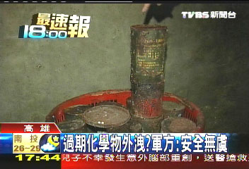 化學(xué)品上頭寫著DS2-消除劑,生產(chǎn)日期是1989年3月,有效期限只能到1992年3月,全是臺(tái)軍聯(lián)勤204廠所制造。制造方表示說:這些被棄過期化學(xué)品“對(duì)人體沒有影響,消除劑里頭有強(qiáng)堿,對(duì)環(huán)境會(huì)有疑慮,我們會(huì)專人回收處理!