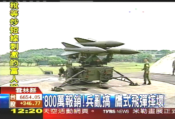 中新網(wǎng)9月8日電 臺灣云林防空導(dǎo)彈部隊爆發(fā)烏龍事件,一名士官帶兵保養(yǎng)鷹式導(dǎo)彈時失誤,導(dǎo)致一枚造價800萬新臺幣的導(dǎo)彈當(dāng)場滑落地面,幸好沒有爆炸,但導(dǎo)彈已經(jīng)報廢而無法使用。