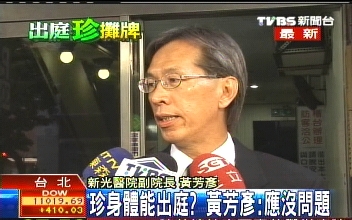 據(jù)臺灣TVBS報道,黃芳彥說:“法院的準(zhǔn)備都很好,我想都有萬全的準(zhǔn)備,因為我不是她的主治醫(yī)師,所以病情我也不了解,也不便多透露,我是她的家庭醫(yī)生,而她的病需要?漆t(yī)生來照顧,我想法院也會以主治醫(yī)師的意見為意見!