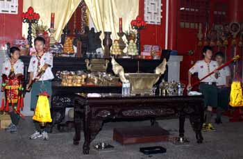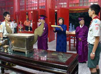 中新網(wǎng)9月28日電 08年嘉義市各界紀(jì)念大成至圣先師誕辰釋奠典禮今天上午如期在嘉義公園內(nèi)孔廟舉行。因薔薇臺風(fēng)來襲,顧及學(xué)生安全,今年首度取消佾舞,并創(chuàng)下由童軍擔(dān)任禮生的先例。不少民眾和小朋友冒著風(fēng)雨到場觀禮,并在祀典后領(lǐng)取智能糕,期能增長智能、學(xué)業(yè)進(jìn)步。