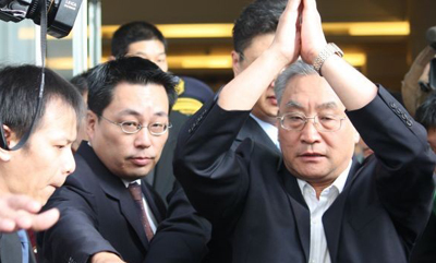 海協(xié)會副會長張銘清22日上午離開臺灣前雙手合十。