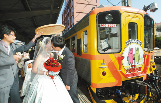 結婚禮車特別在臺中縣追分站停下來,讓新人拍照,“追求婚姻得滿分!”賓客們高聲送上祝福。