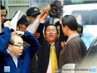 一段是邱毅被拔掉假發(fā)時(shí),雙手趕緊遮著頭,表情無(wú)奈的畫(huà)面,一段是在11月11日,陳水扁被聲押時(shí)高舉手銬喊著“政治迫害!司法冤獄!”畫(huà)面 。