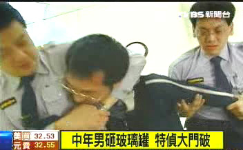 上午10點半,一名年約30出頭的男子在特偵組附近徘徊,突然以手中的玻璃罐扔擲特偵組大門,大門口玻璃門應(yīng)聲碎裂,而砸門人士也立刻遭到法警制服,并帶回偵訊。