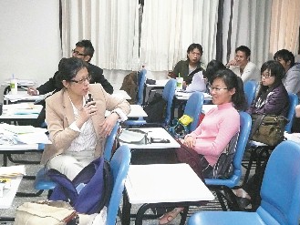 臺灣靜宜大傳系助理教授陳明媚(左)在“色情片分析“課堂上,與學(xué)生溝通,內(nèi)容直接露骨。圖片來源:臺灣《聯(lián)合報》