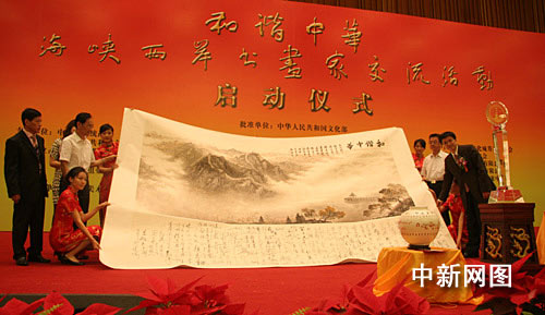 啟動儀式上展出了15幅丈八巨幅書畫作品,全部是著名書畫家的新近之作。由兩岸眾多書畫家聯(lián)袂創(chuàng)作的丈二國畫《和諧頌》,集中展示了當代書畫界的最高藝術(shù)成就。此幅畫作將作為特殊禮品贈送給海峽交流基金會。
