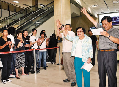 許榮淑踏進入境大廳,立刻有掌聲為她加油,三重市黨部動員許多民眾接機,可是仔細一看,這一整群的支持者還真有殺氣,穿著打扮不是黑就是白,即使在室內(nèi)也要戴墨鏡,就像在拍香港古惑仔的電影,身上的刺青格外引人注目,唯一跟港版古惑仔不同的是,臺灣的熱血男兒們嚼著檳榔。這些支持者不但搭4輛游覽車來相挺,還帶著打扮清涼火辣的辣妹一同觀摩政治人物如何造勢。