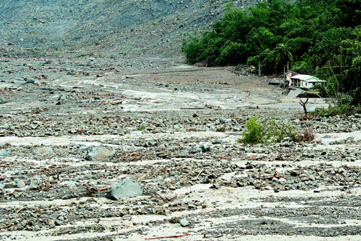 小林村幾乎難以辨認(rèn),一片爛泥石堆旁只有兩間民宅。村里民眾說(shuō),這兩間民宅本在村子地勢(shì)最高處,如今村子被土石流全吞掉,變成鄰近溪邊。房子被埋了,現(xiàn)地靜寂,全無(wú)人煙,救難人員無(wú)用武之地,雖然背著救援物資千辛萬(wàn)苦趕來(lái),卻沒(méi)救到人,短暫搜尋后撤回甲仙。