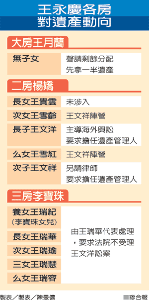今年五月,王永慶長(zhǎng)子王文洋瞞著家族,向美國(guó)新澤西法院跨海興訟,要求調(diào)查王永慶海外資產(chǎn),并申請(qǐng)擔(dān)任遺產(chǎn)管理人。這件臺(tái)灣史上金額最高的遺產(chǎn)官司昨天首次開庭,卻又爆出同為二房的王文祥、王雪紅等也要求取得遺產(chǎn)管理人資格,讓官司更復(fù)雜。