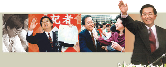 1986年,陳水扁擔(dān)任臺(tái)北市議員,因蓬萊島事件入獄,但也為他政治生涯加分;擔(dān)任“立委”期間,他一再揭發(fā)軍購弊案,被民間團(tuán)體票選為第一名“立委”;1994年,他當(dāng)選臺(tái)北市長,施政滿意度一度高達(dá)76%;2000年,他當(dāng)選第一次政黨輪替的臺(tái)灣地區(qū)領(lǐng)導(dǎo)人;昨天,他卻成為第一位手銬加身的前領(lǐng)導(dǎo)人。