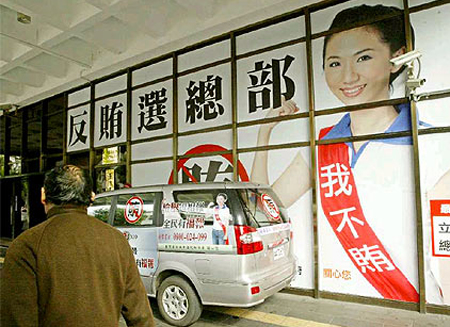 臺(tái)灣兩大選舉即將來(lái)臨之際,為宣示查賄決心,檢警部門連手吸收政風(fēng)人員及網(wǎng)民全臺(tái)布雷搜集情資,各處檢調(diào)單位也掛出大型反賄選海報(bào)!吨袊(guó)時(shí)報(bào)》圖 林勝發(fā) 攝
